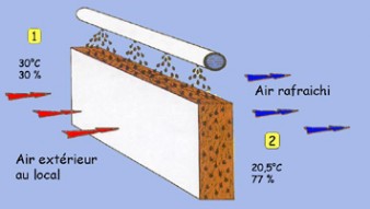 PrincipeL'évaporation d'une très faible quantité d'eau nécessite de prélever la chaleur au milieu ambiant, ce qui a pour effet d'abaisser son niveau calorifique. Ce principe est mis à profit pour diminuer la température ambiante du local.Un ventilateur centrifuge ou hélicoïdale aspire l'air à travers d'une surface d'échange maintenue humide grâce à la circulation de d'eau assurée par une pompe. L'évaporation de l'eau de la surface d'échange au contact de l'air se traduit par un abaissement de la température. Ainsi l'air rafraichi est distribué dans le local.