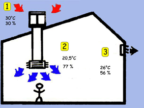Lors du passage de 2 à 3, l'air a prélevé dans le localune certaine quantité de chaleur provoquant un abaissement de la température intérieure.