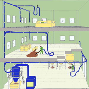 Avec ce système, les déchets, poussières, ou autres matériaux aspirés en différents lieux sont transportés par un réseau de tuyauterie en un seul point central de stockage.